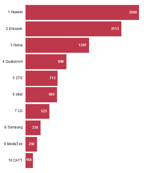 Figure 2 Ranking by the number of ETSI declared NB-IoT standard essential patents
